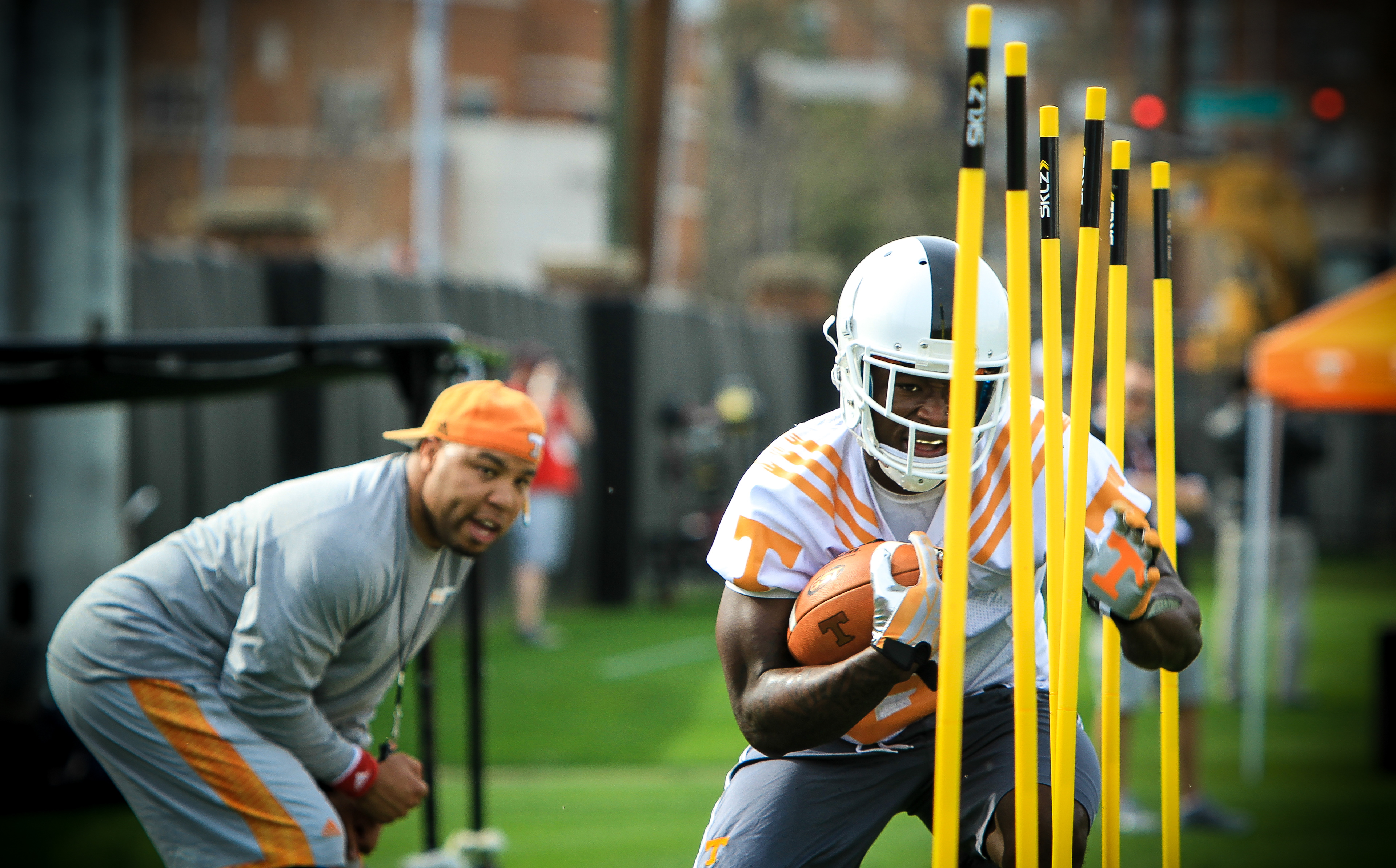 Alvin Kamara weaves his way back and forth between obstacles as running backs coach Robert Gillespie urges him on